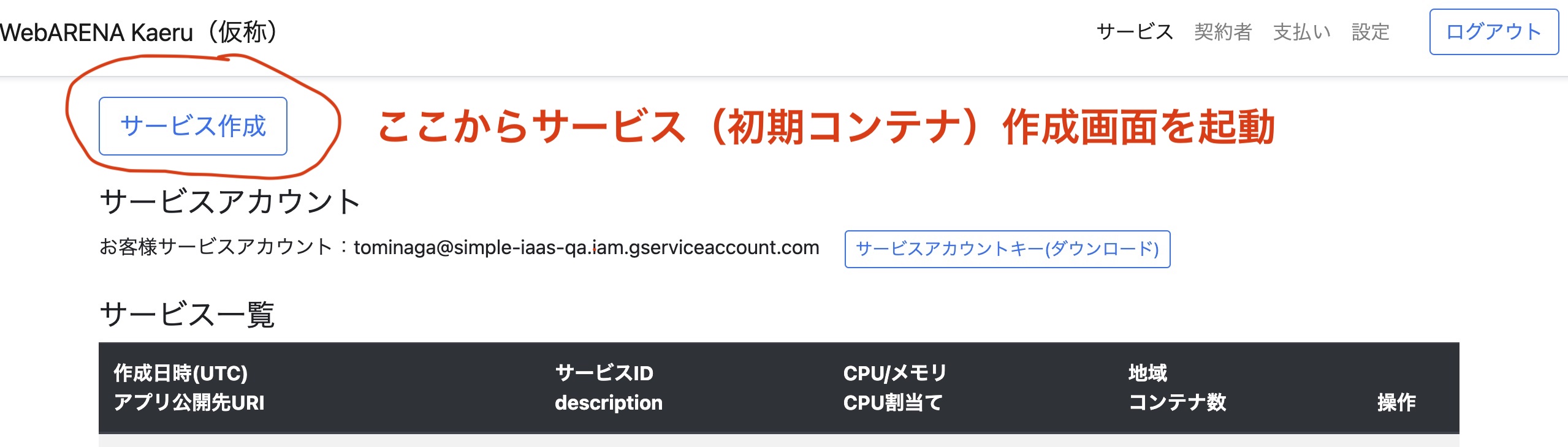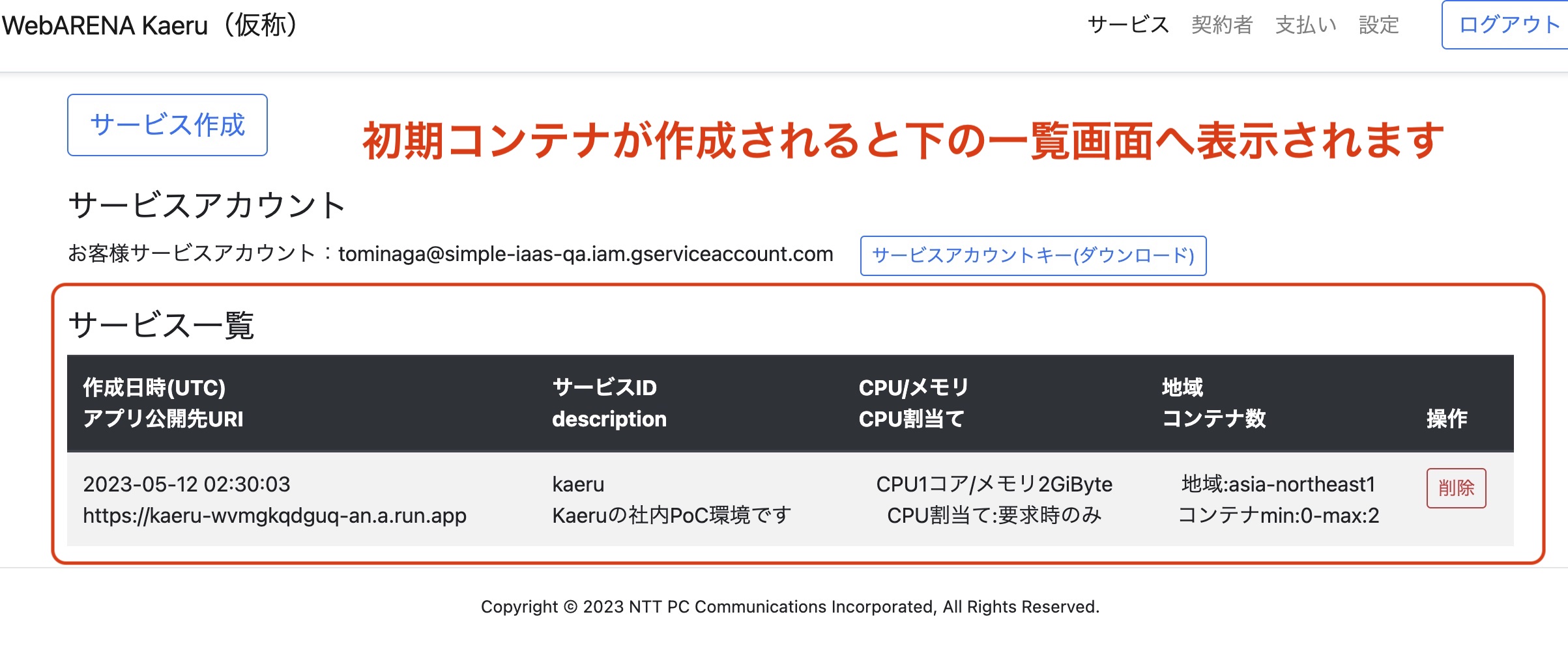 | サービス利用方法 | ①ユーザ登録 ・ユーザ登録時、GCPのサービスアカウントが裏で作成されます。画面下側から登録できます。 ・ログイン後、サービスアカウントキーファイルをダウンロードします ②初期コンテナを作りましょう ・kaeruコンパネからコードのデプロイ先となる初期コンテナ(HelloWorld)を作ります。 ここで指定したサービスIDはあとで使います。 ③あなたの開発環境からサービスアカウントでクラウド(GCP)へアクセス ・ダウンロードしたサービスアカウントキーファイルを使ってクラウド(GCP)へアクセスします <gcloudへのログイン> コマンド例:gcloud auth activate-service-account --key-file=XXXXXXXX.json(ダウンロードしたファイル名) <gcloud ログイン状態の確認> コマンド例:gcloud auth list <gcloud ログアウト> コマンド例:gcloud auth revoke ・開発マシンから直接クラウドへアプリをデプロイします <gcloudコマンドで開発マシンのディレクトリ(カレント)内のソースをデプロイ> コマンド例:gcloud run deploy XXXXXXXXX<サービスID> --project simple-iaas-qa<今回PoCでは固定> --region asia-northeast1 --platform managed --source . 以下の順番で処理が自動で実行されます。コンテナイメージ作成が長引く場合、数分間かかります。待ちましょう。 処理1 クラウドストレージへのソースアップロード、 処理2 BuidPackによるコンテナイメージ作成 処理3 Artifact registoryでのリビジョン管理、プログラムの検疫(不正なプログラムの検出) 処理4 Ingressプロキシとコンテナの接続、サービスのデプロイ ④アプリ公開先URIへアクセスし、アプリが正常にデプロイされたことを確認 |